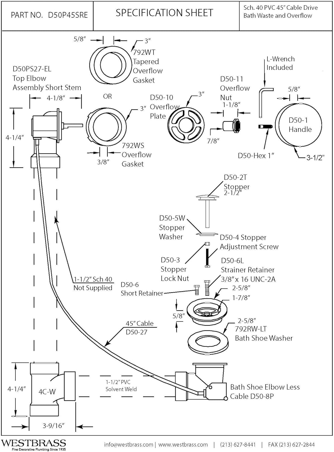 Use this cable driven bath waste and overflow assembly trim kit from Westbrass for the finishing touches to your bathtub. The PVC solvent weld assembly with contemporary metal trim includes a large size 1-1/2 in. pop-up stopper with strainer plate. Top elbow handle mounts with a short stem. 45 in. cable operates the adjustable brass pop-up. Rotate the knob to close the drain. Turn it in the opposite direction to open the drain. The bolt on the adjustable plunger base allows proper flow adjustment, for bathtub drainage. Do not use plumber's putty for installation use silicone seal. Available in a variety of stylish finishes, this item is sure to complement your existing fixtures. Be sure to check out our other model styles and VISIT OUR WESTBRASS STOREFRONT for more Kitchen and Bath items to stylize your home with convenient functionality and beauty.