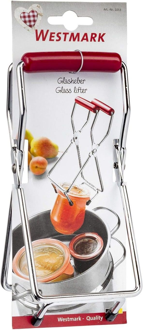 Use this glass jar lifter to easily and safely remove preserving jars from hot water or from a canning device. Resulting from its practical 4 point design, the lifter is suitable for a range of different jar shapes and diameters. It is 22cm/8.7in long and 8cm/3.1in wide. The lifter is made from chrome plated metal, has rubber coated lifting tongs with an ABS handle.Westmark of Germany is well known for its quality craftsmanship of kitchen tools. Westmark has been making reliable kitchenware for over 50 years, and offers a wide range of practical and ingenious kitchen products designed to make cooking easier. Westmark designs and produces many of their products in Elspe, Germany, where a team of highly trained specialists work to produce their amazing kitchen gadgets. Their numerous tools provide for virtually all possible food preparation needs in the kitchen. For kitchenware you can rely on, choose Westmark.