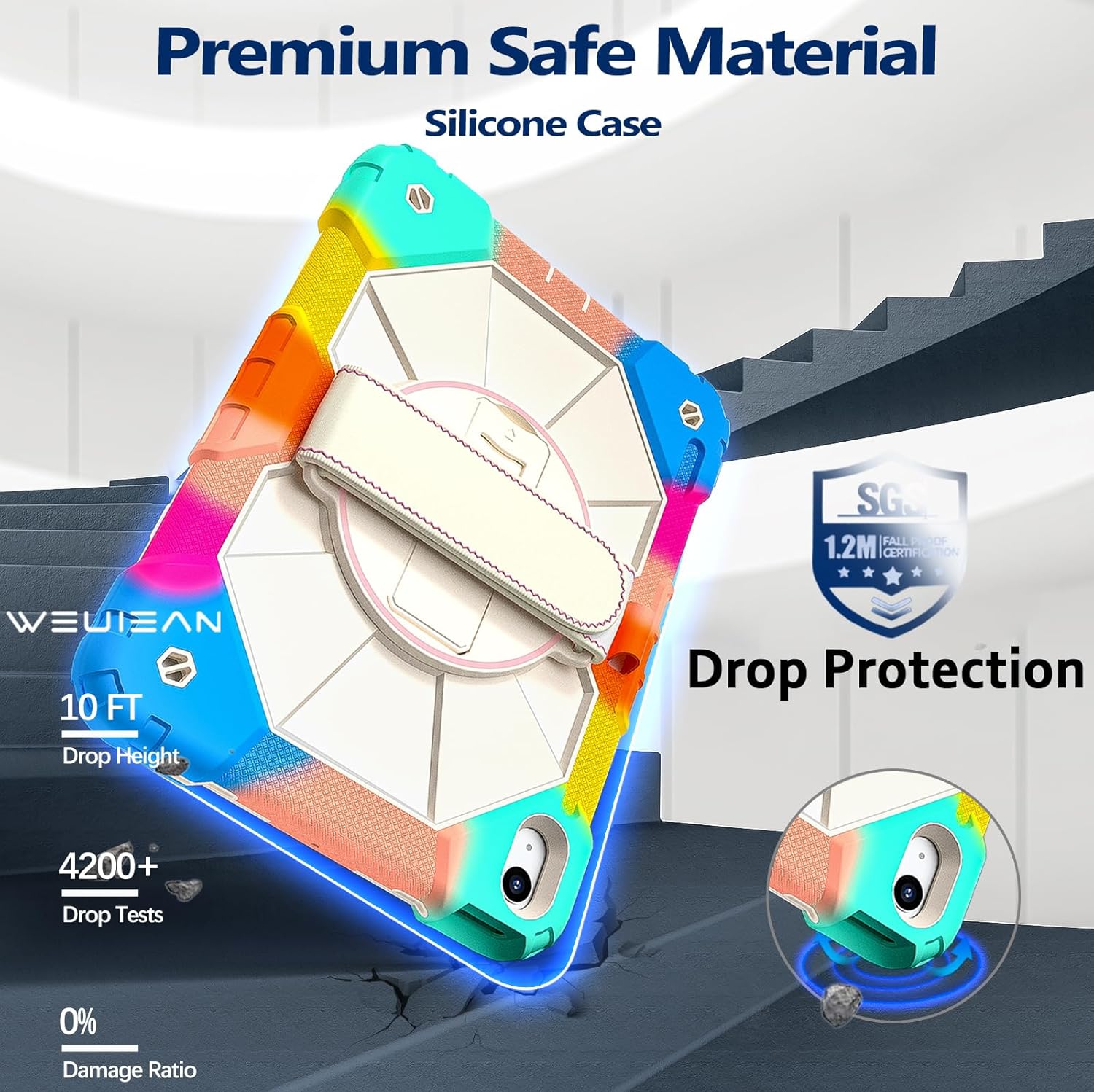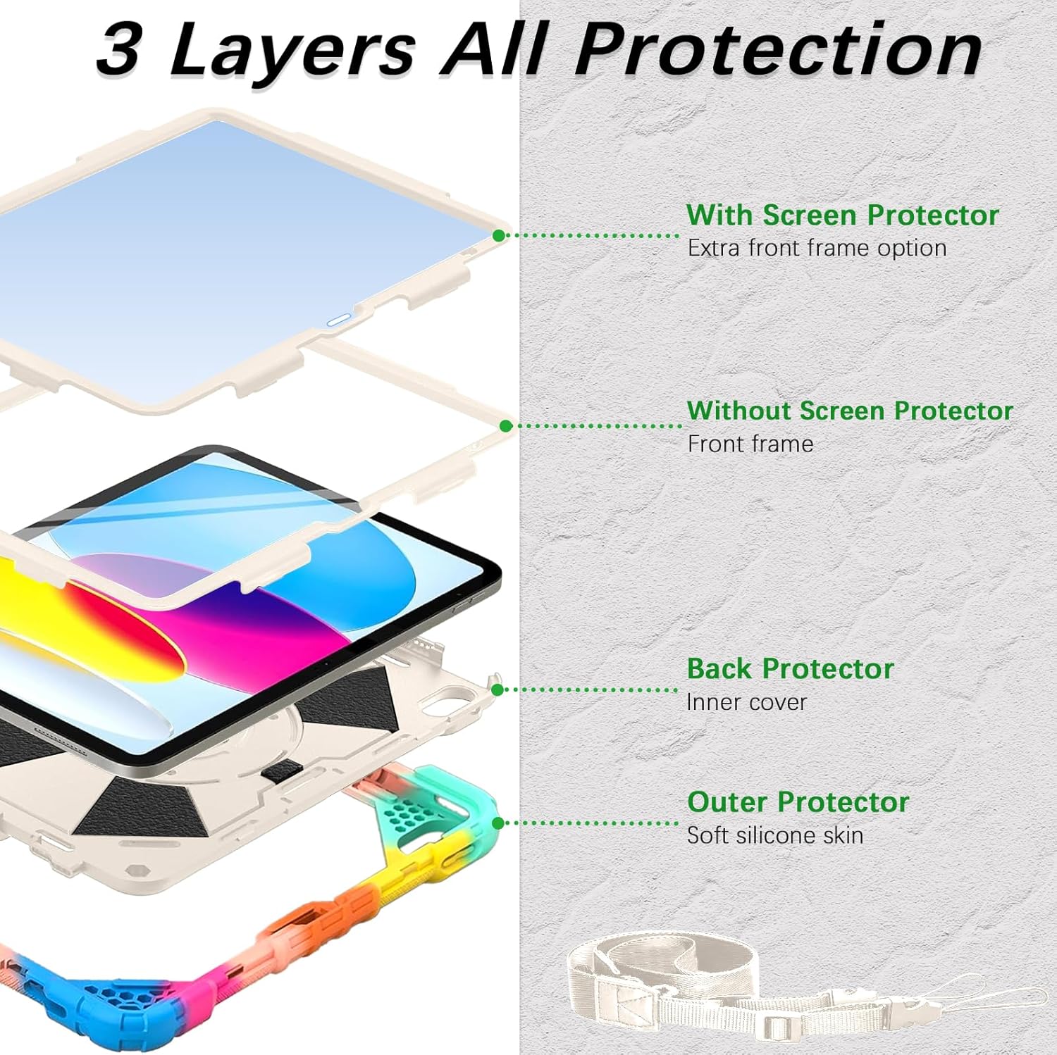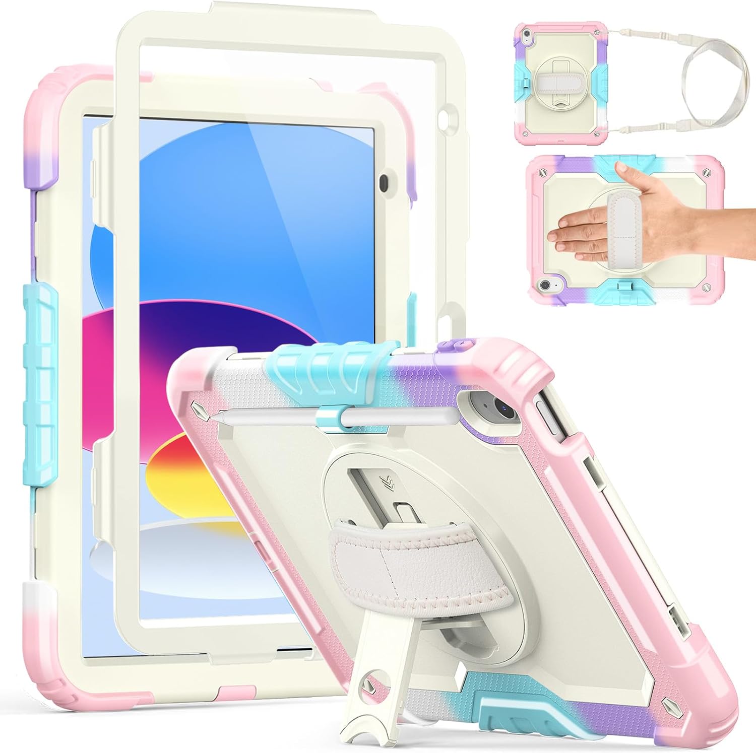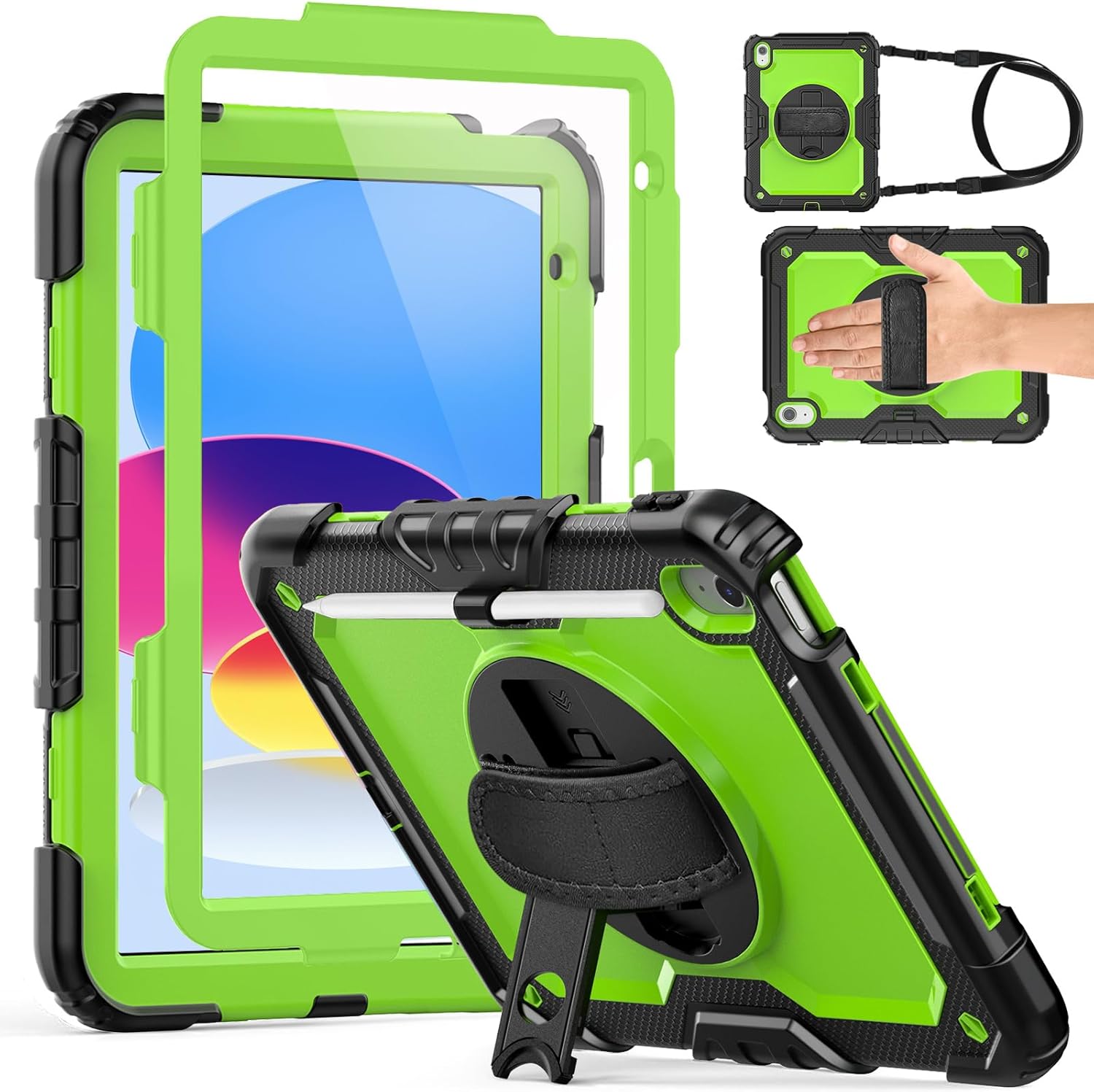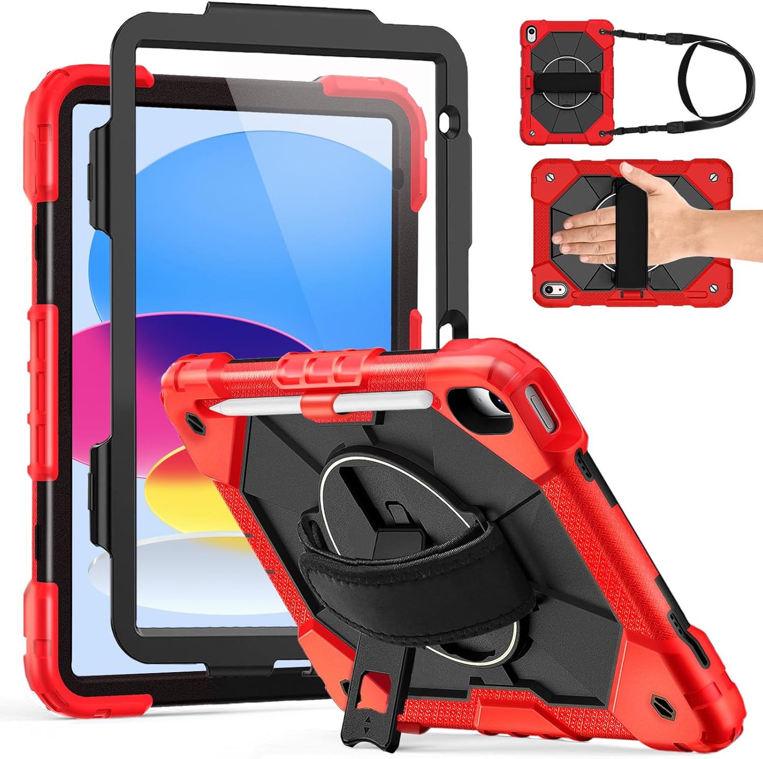 | Additional Features | 360° Rotating Hand Strap, Kickstand, Screen Protector, Shockproof case for iPad, Shoulder Strap |