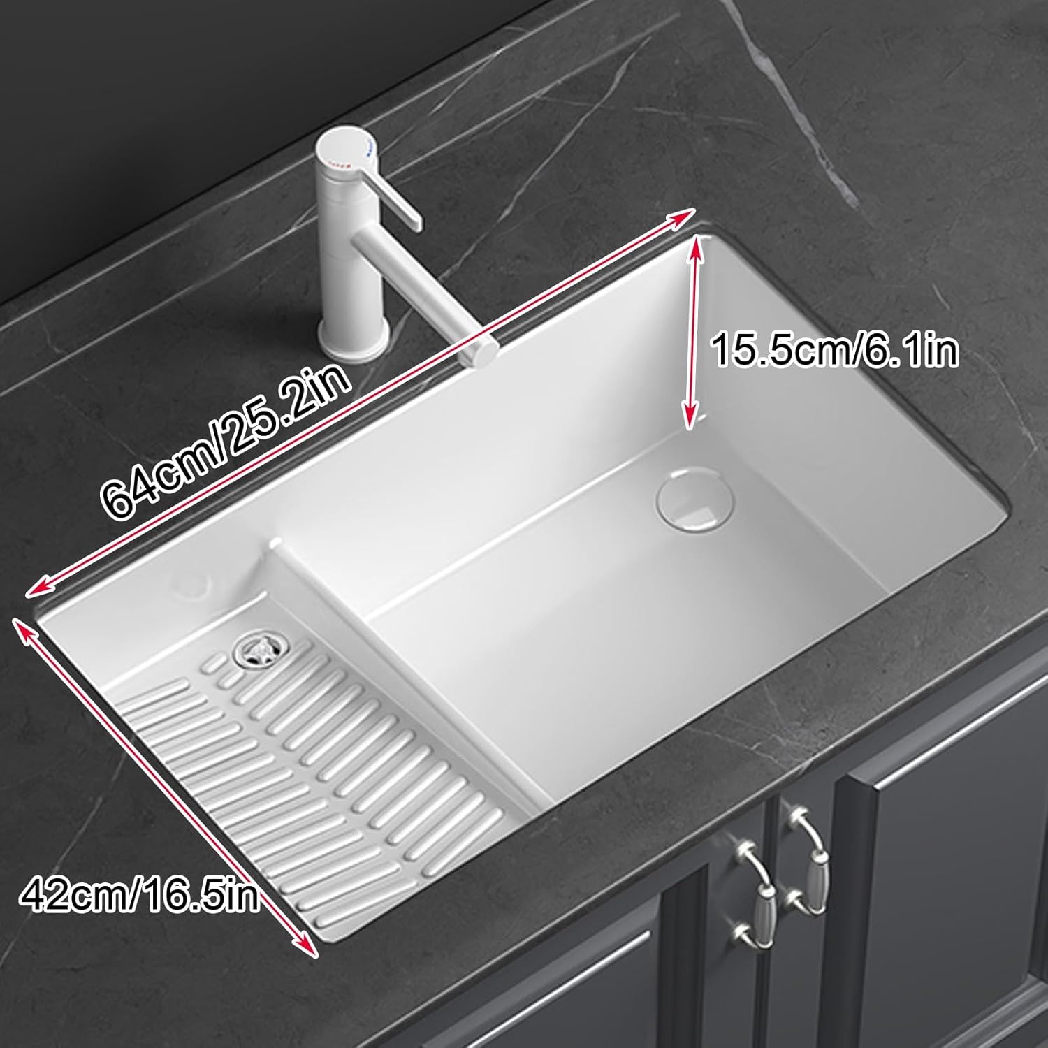 The carefully designed washing board area features clear, ergonomic grooves that effectively increase friction, facilitating stain removal and hand washing of delicate items. Built-in washboard eliminates the need to take out (and stow) a bulky washboard for washing small items. You can hand wash clothes, tea towels or delicate garments at any time. After washing, water flows directly into the sink (instead of splashing the countertop), so you no longer have to clean up water spills on the countertop. ▶ Product Specifications: ♦ Product Name: Kitchen/Laundry Sink (with washing board) ♦ Material: Ceramic ♦ Shape: Rectangular ♦ Colour: white. ♦ Installation Method: Undercounter Mount ♦ Dimensions (L x W x D): 44 x 35 x 14.5 cm / 17.3 x 13.7 x 5.7 inches. 48 x 38 x 14 cm / 18.9 x 15 x 5.5 inches. 53 x 39 x 17 cm / 22.8 x 16.1 x 6.5 inches. 58 x 41 x 16.5 cm / 22.8 x 16.1 x 6.5 inches. 64 x 42 x 15.5 cm / 25.2 x 16.5 x 6.1 inches. 68 x 41.5 x 17.5 cm / 26.7 x 16.3 x 6.9 inches. 73.5 x 42 x 19 cm / 29 x 16.5 x 7.5 inches. ▶ Package Content: 1 x laundry room with washing board. 1 x tap. 1 x waste pipe. 1 x Anti-odor drainage system