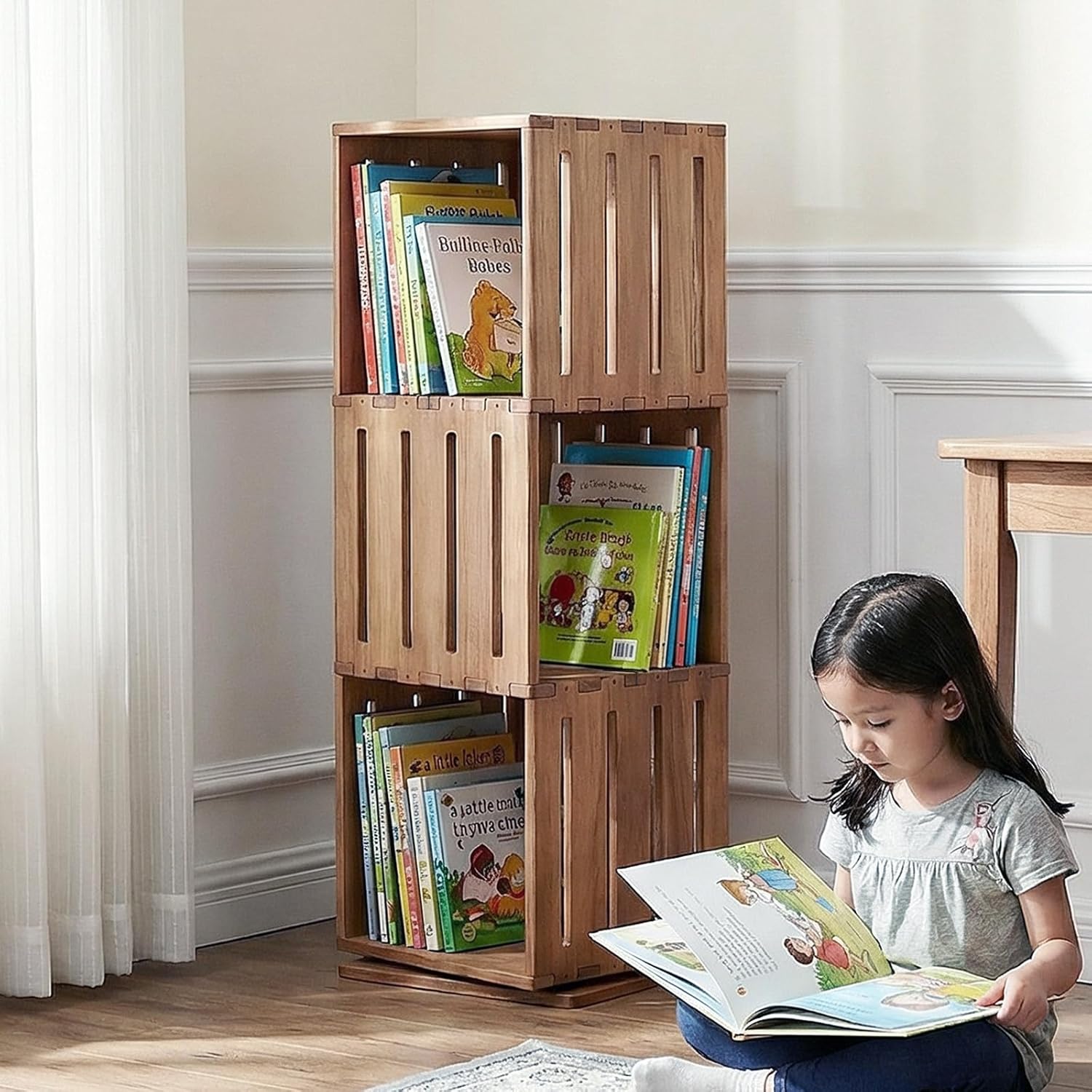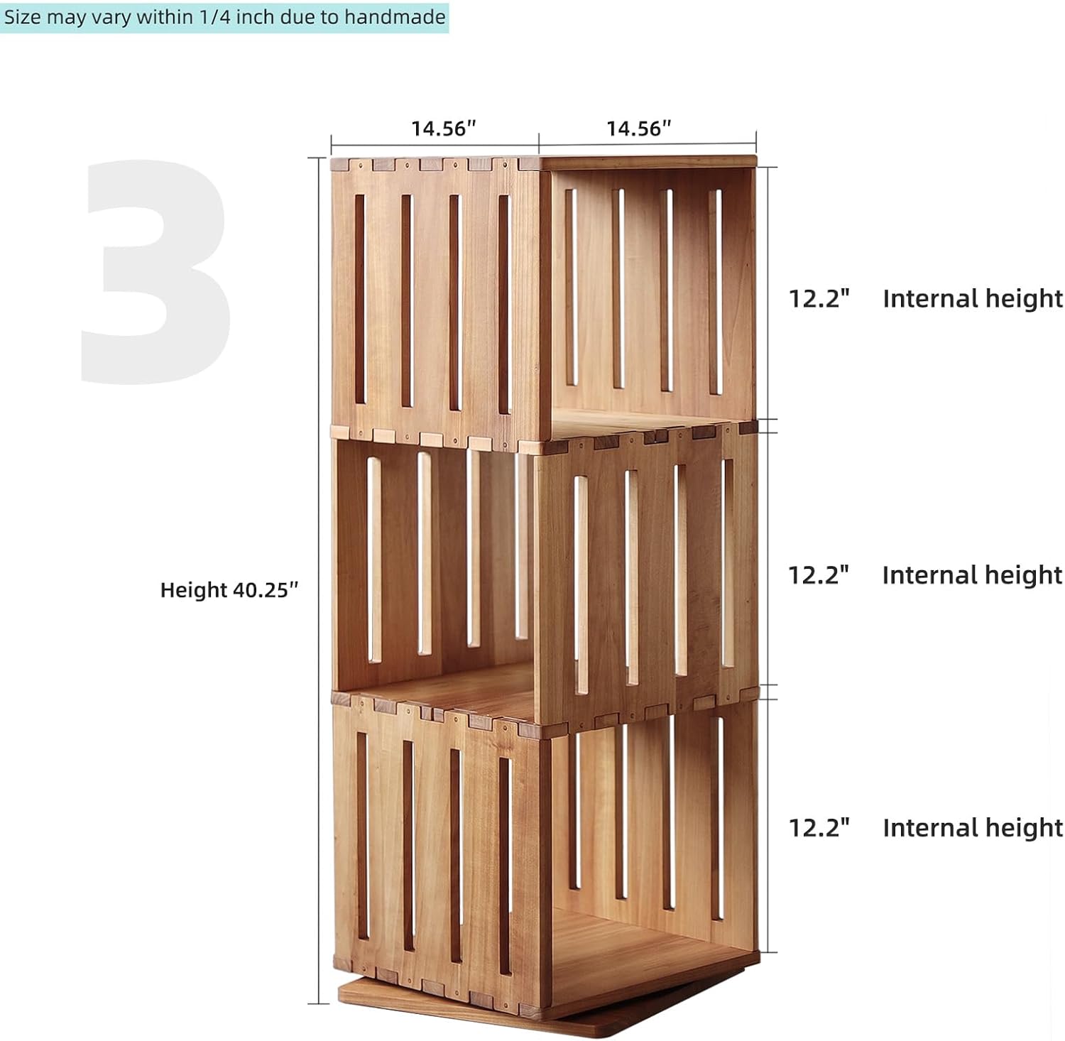 More than a bookshelf—it’s a living archive for your story. Crafted to hold not just books, but the chapters of your life, this solid wood rotating bookcase combines timeless craftsmanship, thoughtful design, and responsible materials into a single, graceful centerpiece.Built to Endure, Designed to Last GenerationsAt its heart lies traditional mortise and tenon joinery—a time-tested technique that ensures exceptional strength and stability. This is not disposable furniture. It’s a durable companion crafted to faithfully hold your collection, from early textbooks to cherished novels, silently standing by as your personal library grows and evolves.Deep, Uninterrupted Storage for What You TreasureSay goodbye to overhang and compromise. Each of the three open tiers offers a full 14.56" x 14.56" surface and a true 12.2" inner clearance, engineered specifically for oversized art books, display albums, binders, and collectibles. The deep, unobstructed bins allow tall volumes to stand upright and valuable items to be stored securely, making it effortlessly versatile for your study, office, or living space.Engineered for Effortless, Stable RotationThe foundation of seamless access is our 12" full-circle steel ball turntable. Occupying nearly the entire base footprint, it provides maximum rotational support. Precision-engineered with smooth-gliding steel balls, the mechanism guarantees fluid, low-resistance spinning with minimal wobble—ensuring stable and effortless operation even when fully loaded.Open Design for Maximum Visibility & AccessDesigned for flexibility over confinement, the open-shelf layout eliminates barriers. Each deep tier can be accessed from both sides, and the staggered orientation of shelves ensures every book spine is visible. A simple spin brings any item to the front, providing instant visibility and retrieval without the need to rearrange or dig.Sustainably Crafted, Uniquely YoursWe believe in building in partnership with nature. Each bookcase is formed from 100% solid wood, sourced with sustainability in mind. Because it is real, natural wood, no two pieces are ever identical—the unique grain and character of your bookcase are a one-of-a-kind signature, reflecting a commitment to environmental integrity and authentic quality.Your Story, Beautifully OrganizedThis is where your collection finds its home. It’s a statement of craft, a solution for space, and a testament to thoughtful living. Rotate through your interests, display your passions, and build a legacy of stories—all with one effortless spin.