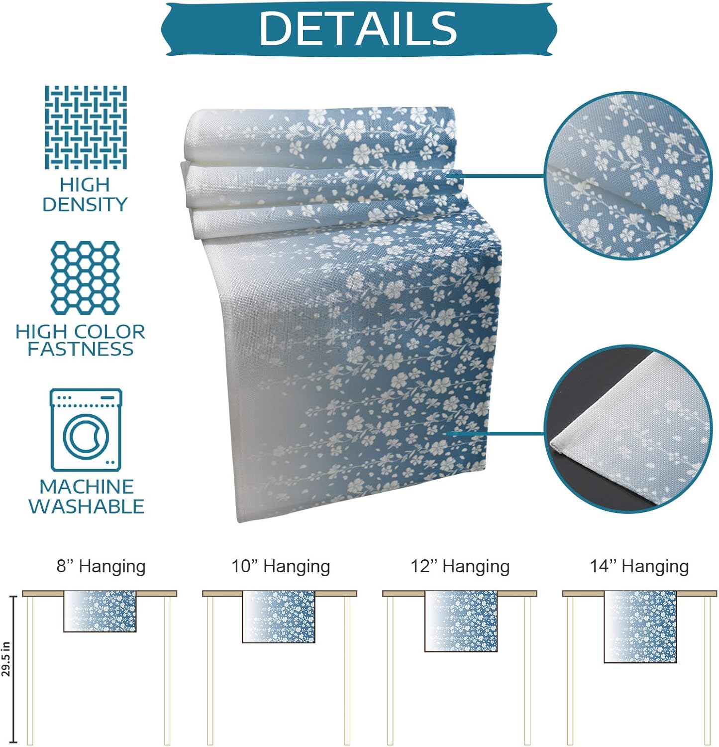 Material Made of high-quality cotton and linen material, not easy to wear and tear, the printed pattern with high color fastness is not easy to fade, protect your table surface from hot pans, scratches and spills. Exquisite Workmanship Table runner and placemats set is surrounded by tight edging, meticulous tailoring, clear routing, and it is not easy to get off the line. Multi Function These delicate table runners could go with coffee table, dining table, sideboard, buffet in any color or style, and perfect for wedding, party, birthday, etc. Perfect Decorations These table runners are perfect for table decor. They also make a great gift for friends and family who love to decorate for the holidays. Easy to manage Doesn't take much time to maintain, machine washable, air dry ready to use, do not bleach, low temperature ironing.