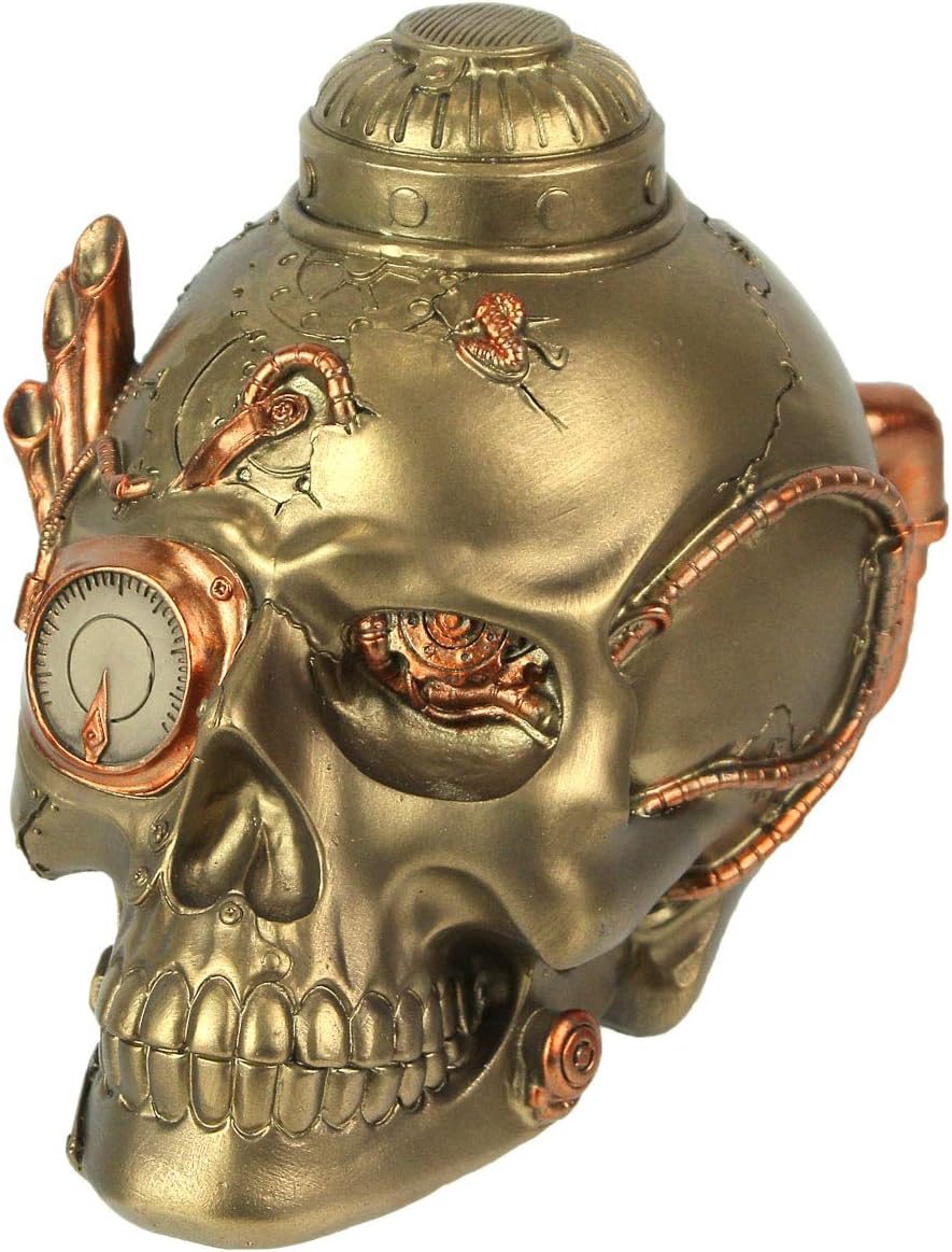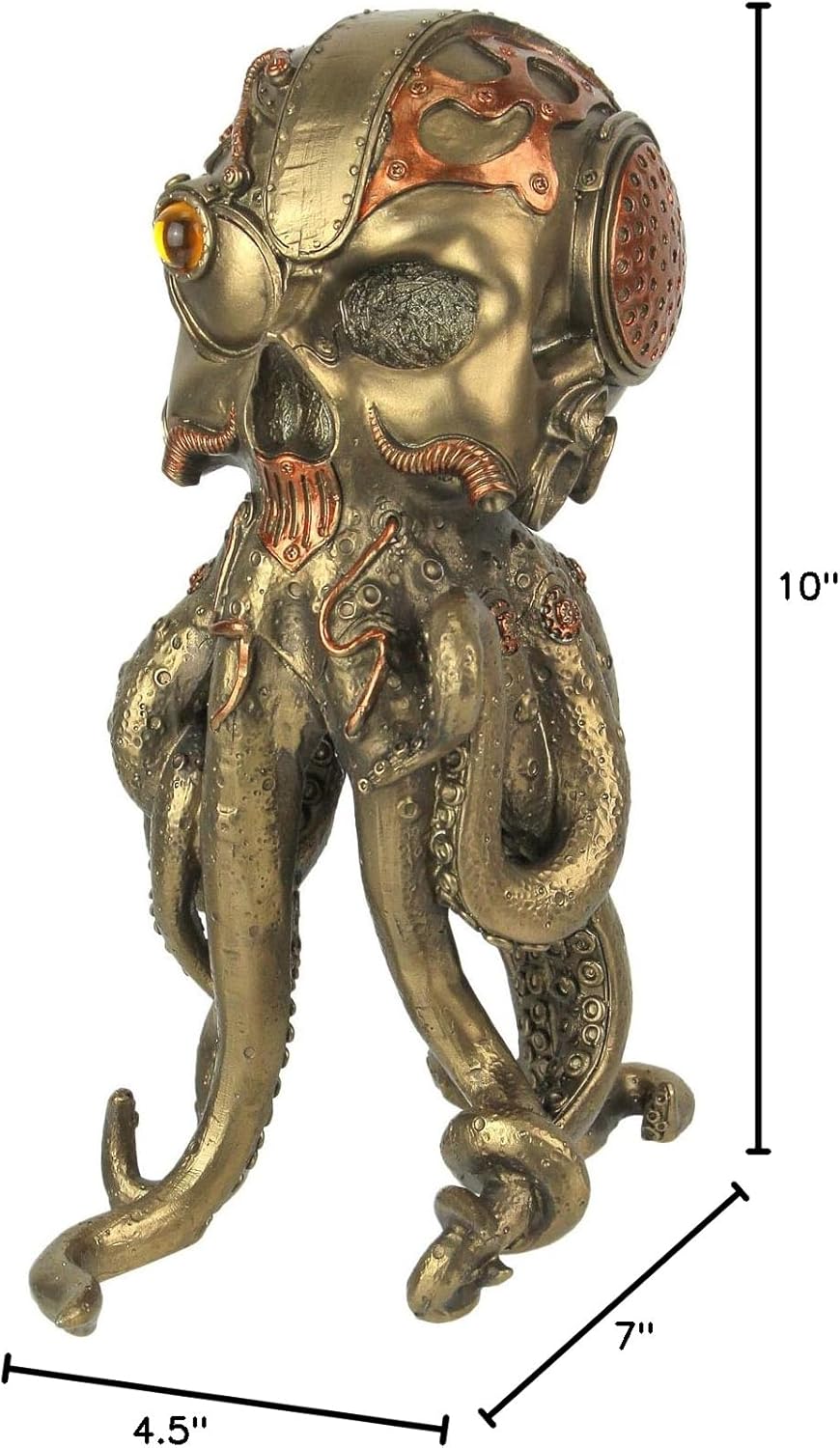 Description OVERALL SIZE: Measures 10 Inches High, 4.5 Inches Long, 7 Inches Wide. CREATIVELY CAST: Single Piece Cast Resin. HAND FINISHED: Hand Painted Copper, Brass, and Gold Accents. STEAMPUNK STYLE: Perfect For Your Bookshelf, Nightstand, or Desk. GREAT GIFT: For Yourself or For Friends and Family. A fusion between the stories of Jules Verne and pirate tales of yore, this awesome tabletop statue combines a human skull with the tentacles of an octopus, with science fiction flair added for a perfect nautical future-past look. This Steampunk cast resin octopus figure has been finished with a bronzed effect and embellished with cogs, dials and chains to create an eye catching piece. It measures 10 inches high, 4.5 inches long and 7 inches wide. It's a perfect addition to any Steampunk or Fantasy collection, and maks a great gift for friends and family. OVERALL SIZE: Measures 10 Inches High, 4.5 Inches Long, 7 Inches Wide. CREATIVELY CAST: Single Piece Cast Resin. HAND FINISHED: Hand Painted Copper, Brass, and Gold Accents. STEAMPUNK STYLE: Perfect For Your Bookshelf, Nightstand, or Desk. GREAT GIFT: For Yourself or For Friends and Family. A fusion between the stories of Jules Verne and pirate tales of yore, this awesome tabletop statue combines a human skull with the tentacles of an octopus, with science fiction flair added for a perfect nautical future-past look. This Steampunk cast resin octopus figure has been finished with a bronzed effect and embellished with cogs, dials and chains to create an eye catching piece. It measures 10 inches high, 4.5 inches long and 7 inches wide. It's a perfect addition to any Steampunk or Fantasy collection, and maks a great gift for friends and family. Additional Details SKU: ZKO-99061 UPC: 810045990613 Condition: New Product Dimensions: 10 x 4.5 x 7 Inch Material: Resin