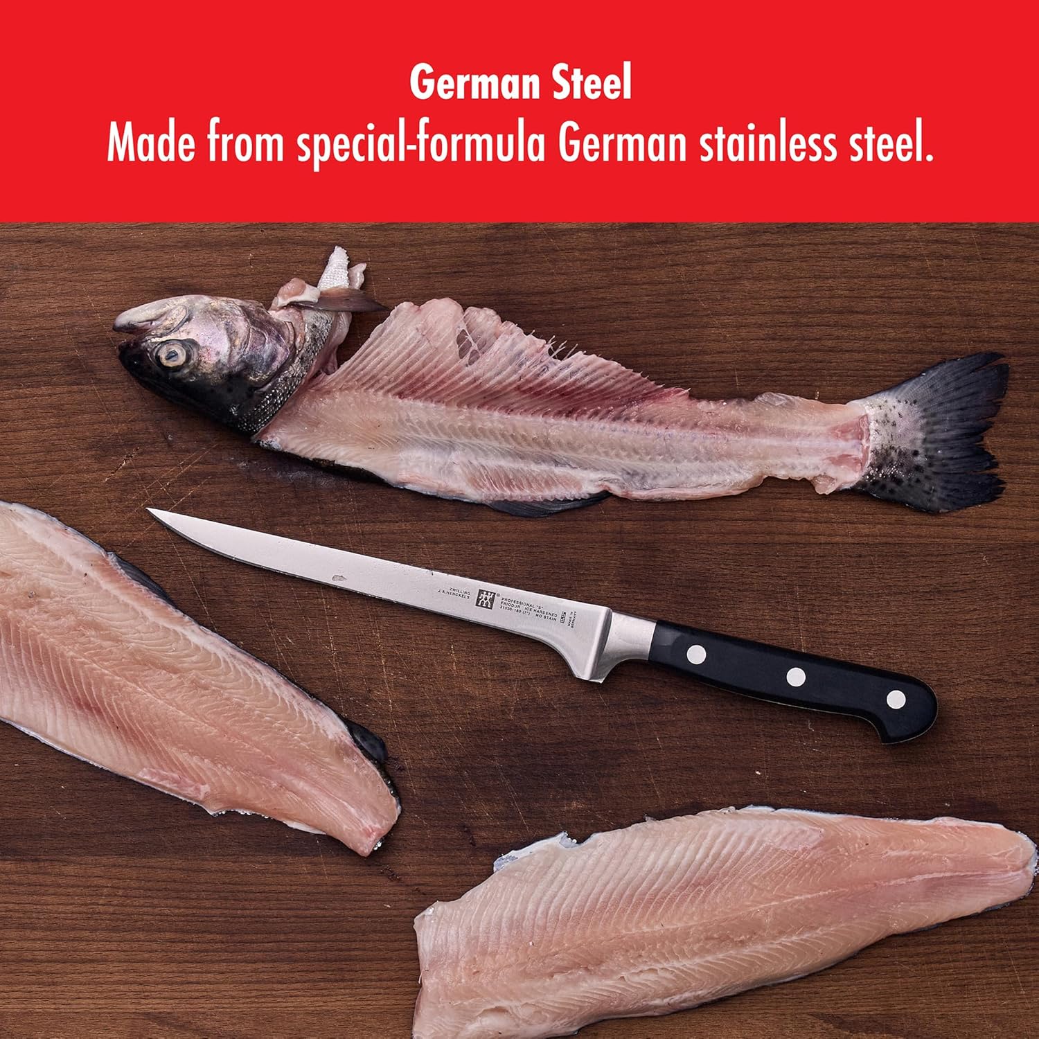 honed and hand-finished by the most skilled artisans, the knives' laser-controlled edge is incredibly sharp. The sturdy bolster provides the right balance and acts as a finger guard. Precision-forged from a single piece of solid steel, these threerivet handle knives deliver optimum balance and safe handling. Professional chefs worldwide trust the tradition and quality of these impressive knives.